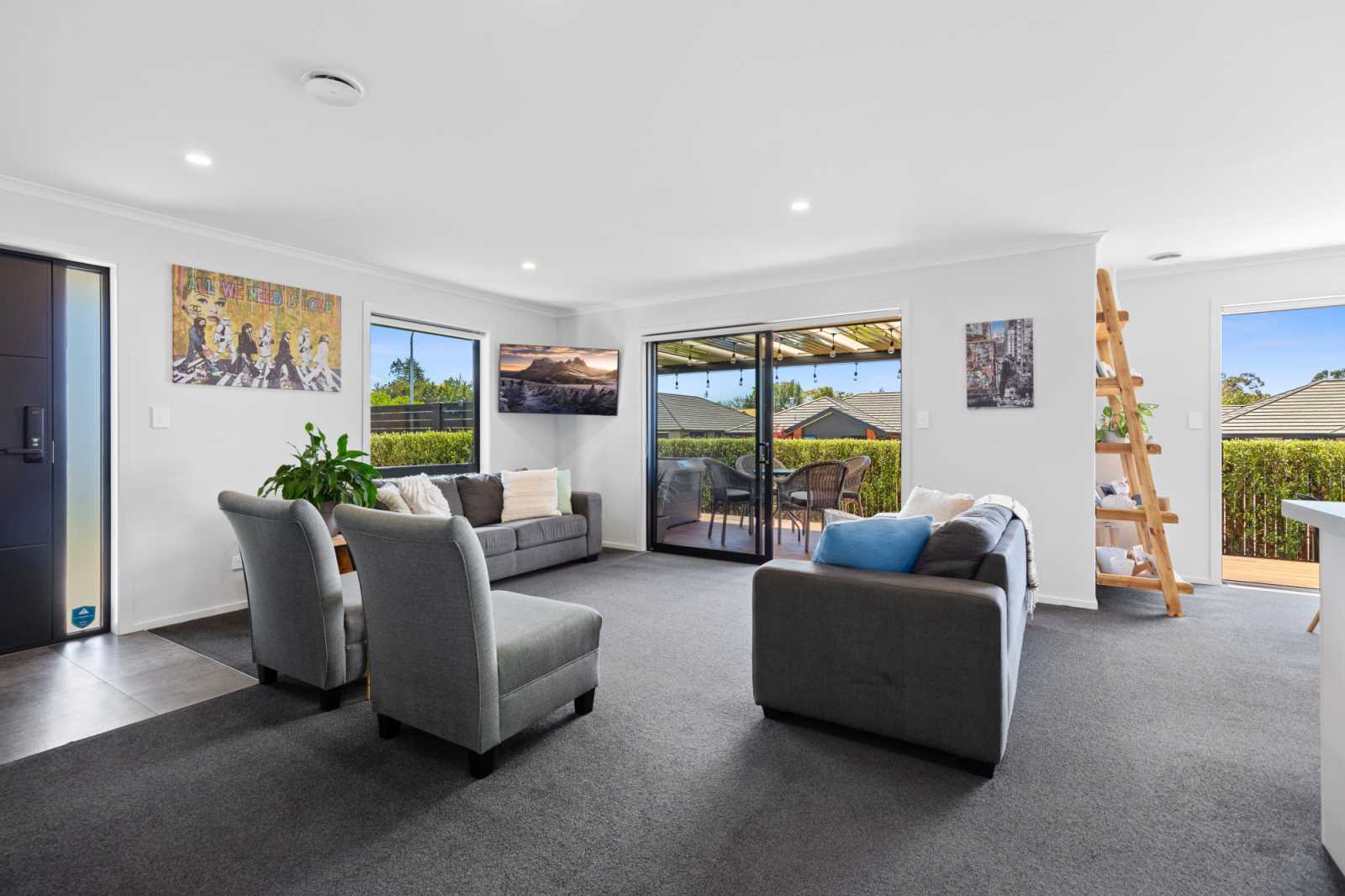 Included in the sale: Fixed Floor coverings. Window coverings. Light fittings. Stove. Hob/Cooktop. Oven. Dishwasher. Waste disposal unit. Heat pump. Range hood. Heated towel rails. TV aerial. Garage door openers. Spa pool. Clothesline. Blinds. HRV system.