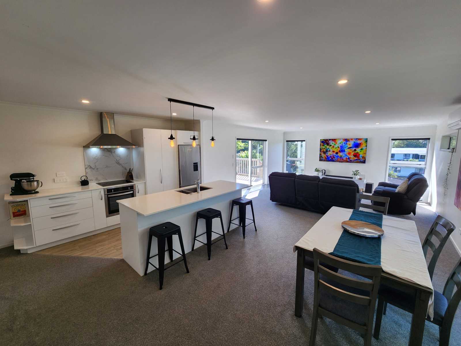 Included in the sale: Fixed Floor coverings. Window coverings. Light fittings. Stove. Hob/Cooktop. Oven. Dishwasher. Waste disposal unit. Heat pump. Range hood. Heated towel rails. TV aerial. Garage door openers. Clothesline. Blinds. Curtains.