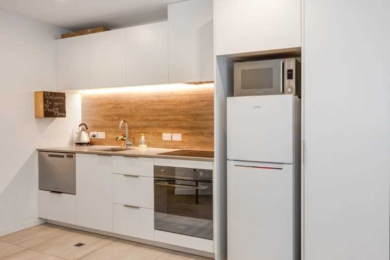 * Modern: Open-plan living/dining with a well-appointed, full size kitchen featuring engineered stone benchtops, ceramic hob, dishwasher, and stainless fittings.