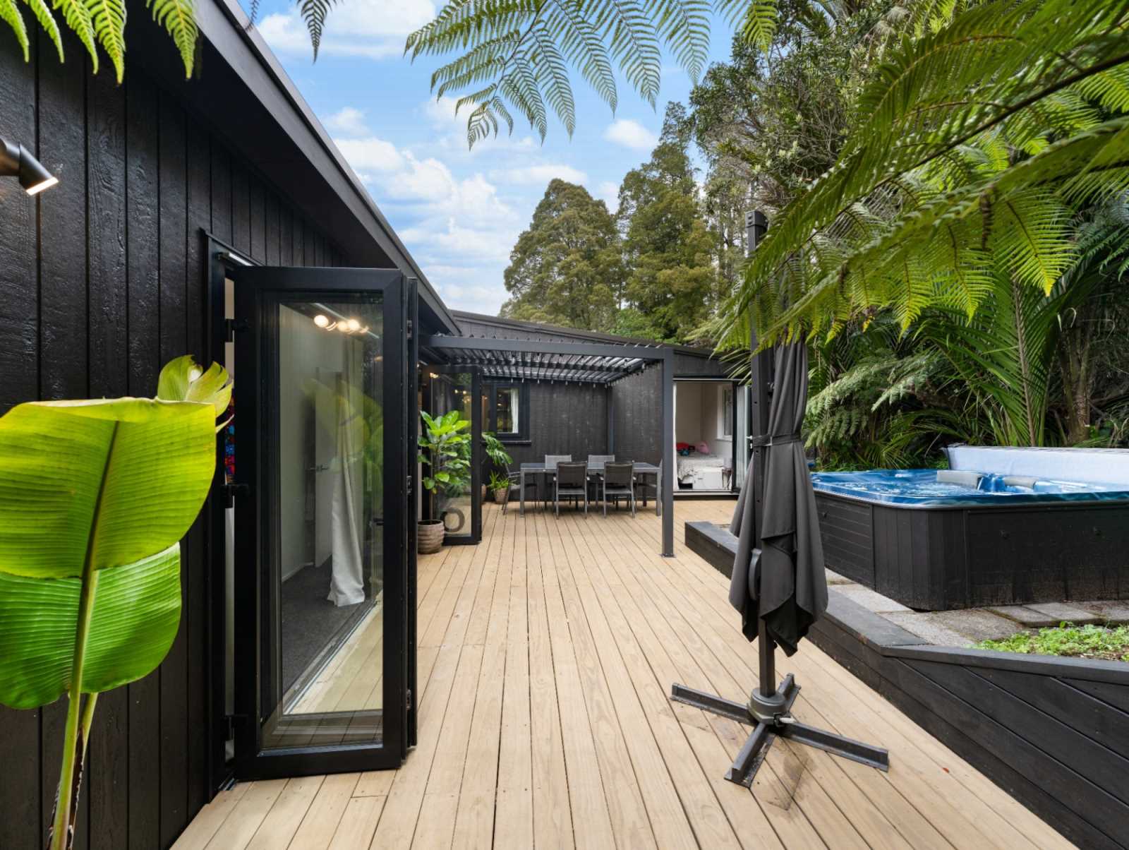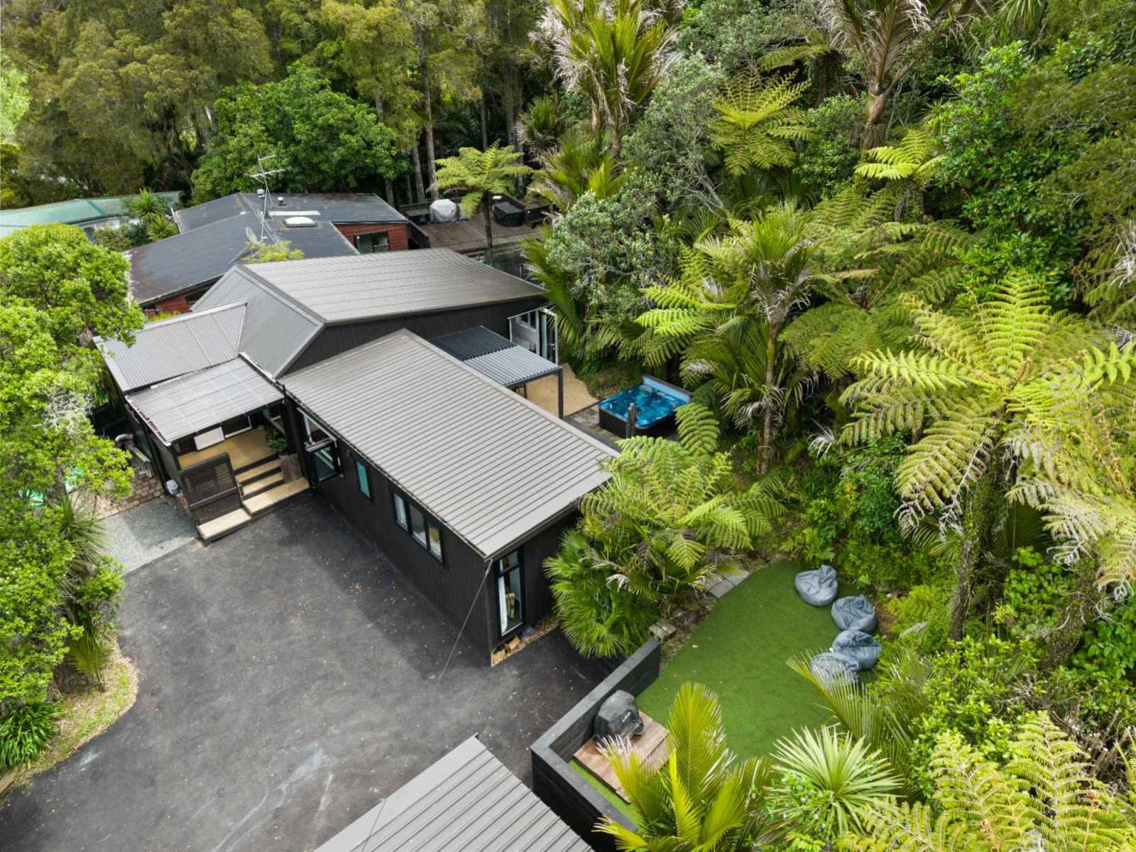 Outdoor living is private and peaceful, with a covered louvre entertaining area, spa, and beautiful bush outlook — it really feels like a retreat. Local beaches are close by, with Piha only around 25 minutes away.