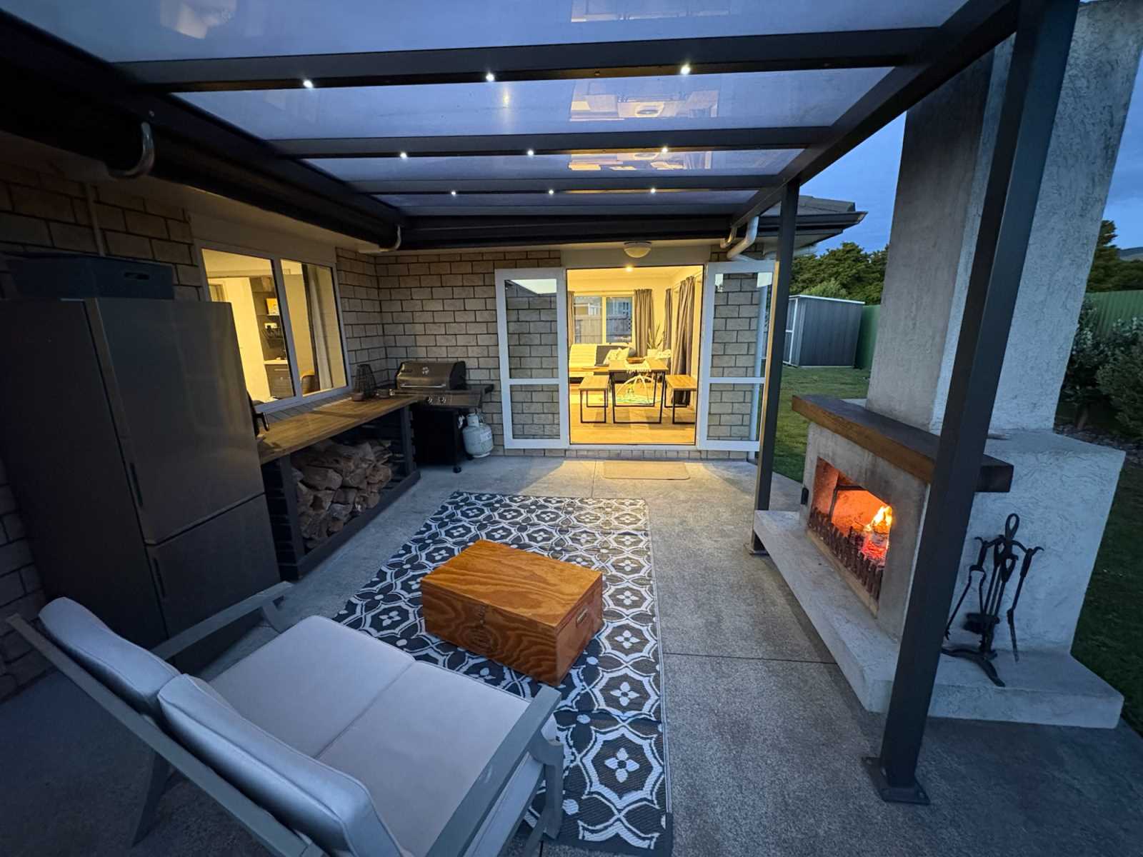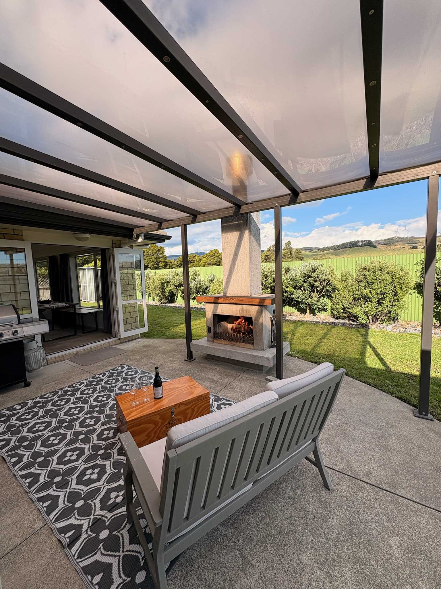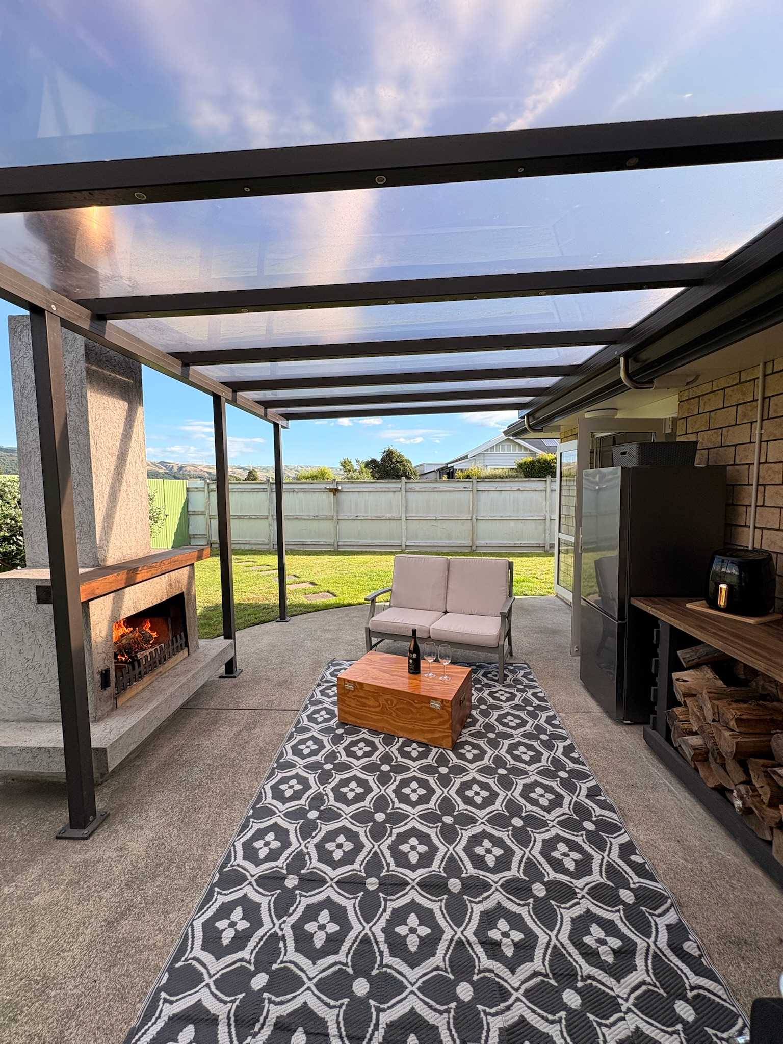 Outside you’ll find an inviting covered outdoor area. Cleverly connected to both indoor living zones, this space is enhanced by an outdoor wood fire, creating a cozy atmosphere for relaxed evenings.