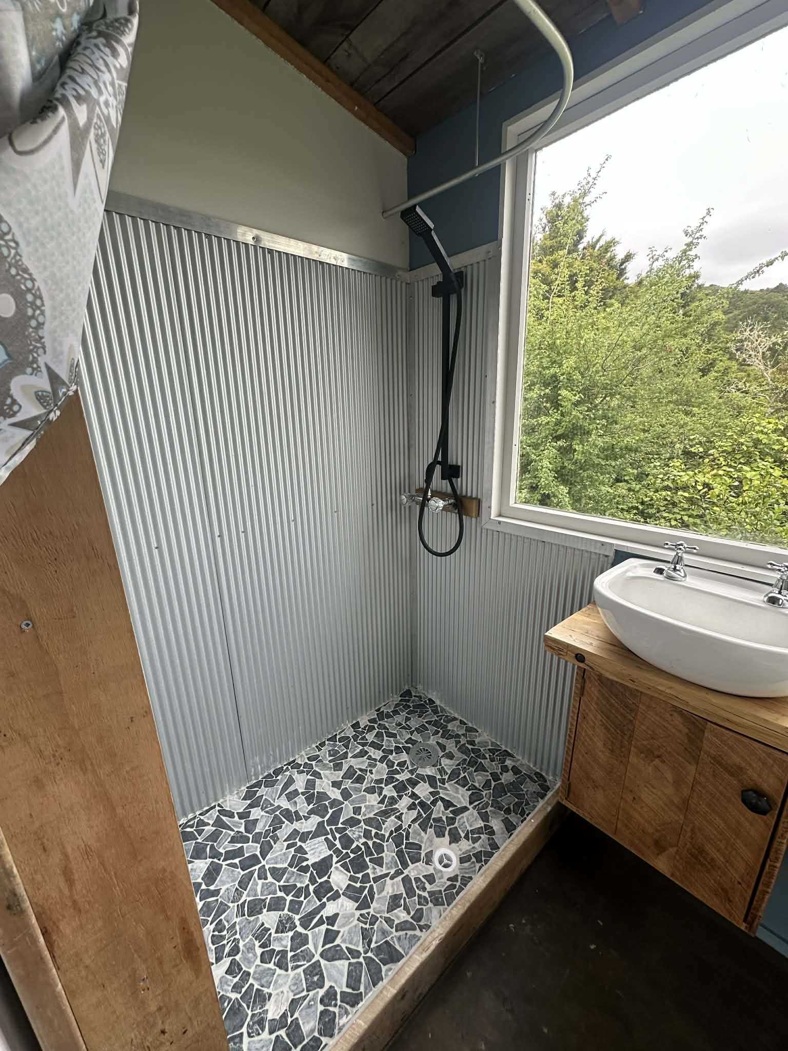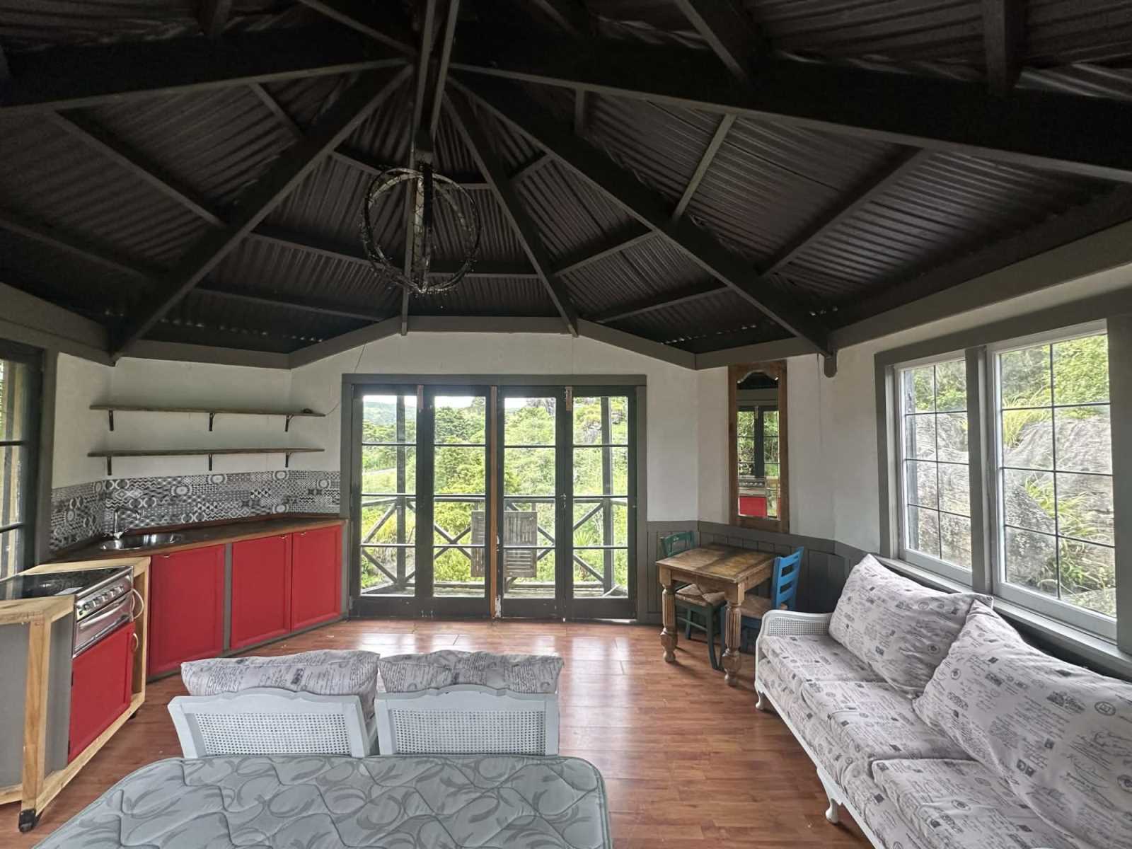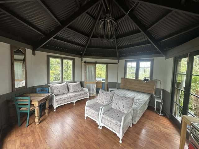 At the opposite end of the property, a self-contained octagonal cabin is privately nestled among the trees and set against a natural rock outcrop. This unique space offers flexible use as guest accommodation, a creative studio, or a quiet retreat surrounded by nature.