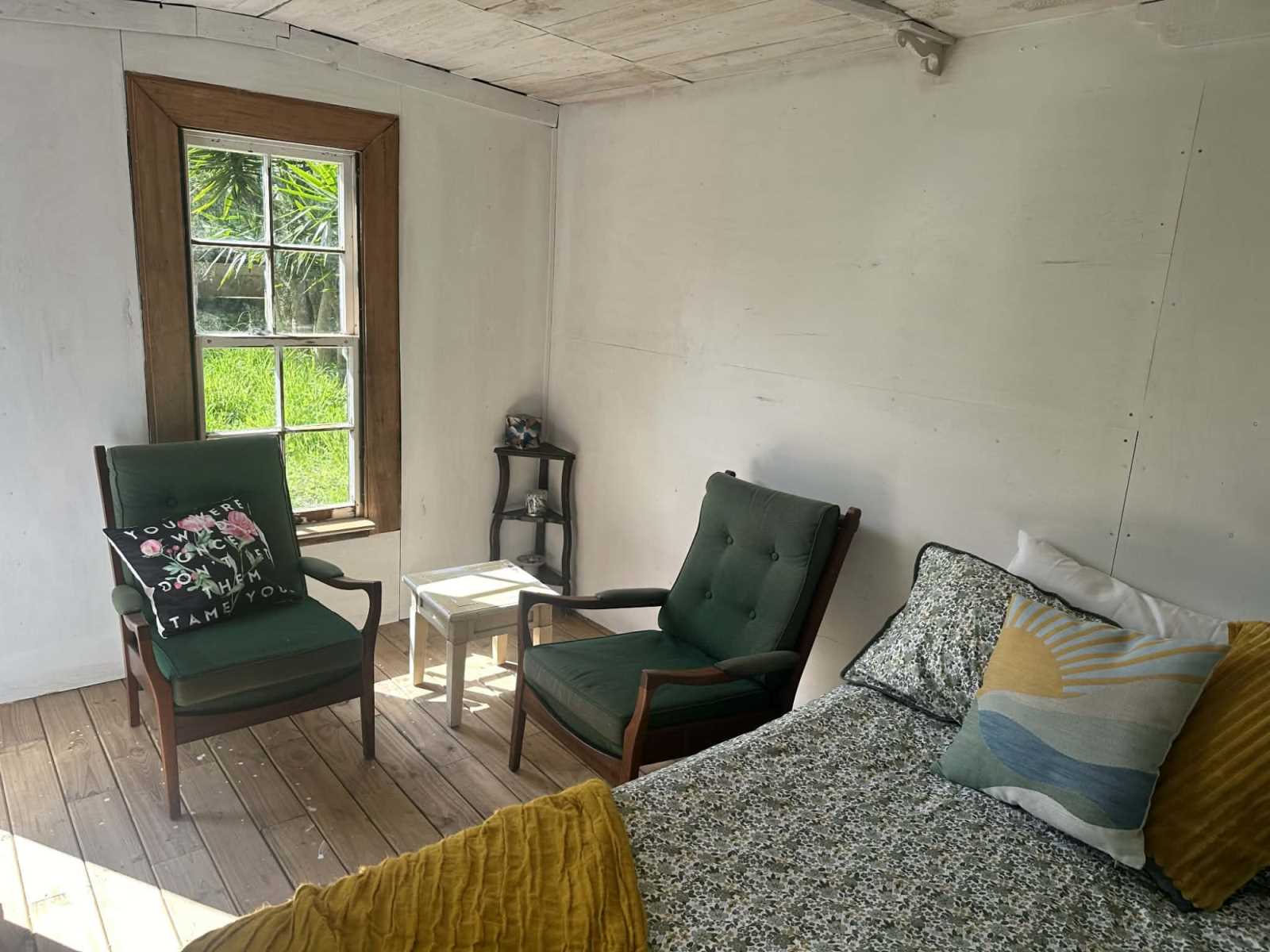 Positioned at one end of the property, the re-sited and renovated villa provides warm and comfortable living. The home includes two bedrooms, a bathroom, an office, and open-plan living. The kitchen features timber detailing and stone benchtops, while a wood burner adds warmth and charm. A generous verandah extends from the living area, offering a peaceful spot to unwind while taking in the elevated panoramic views across the surrounding landscape.
